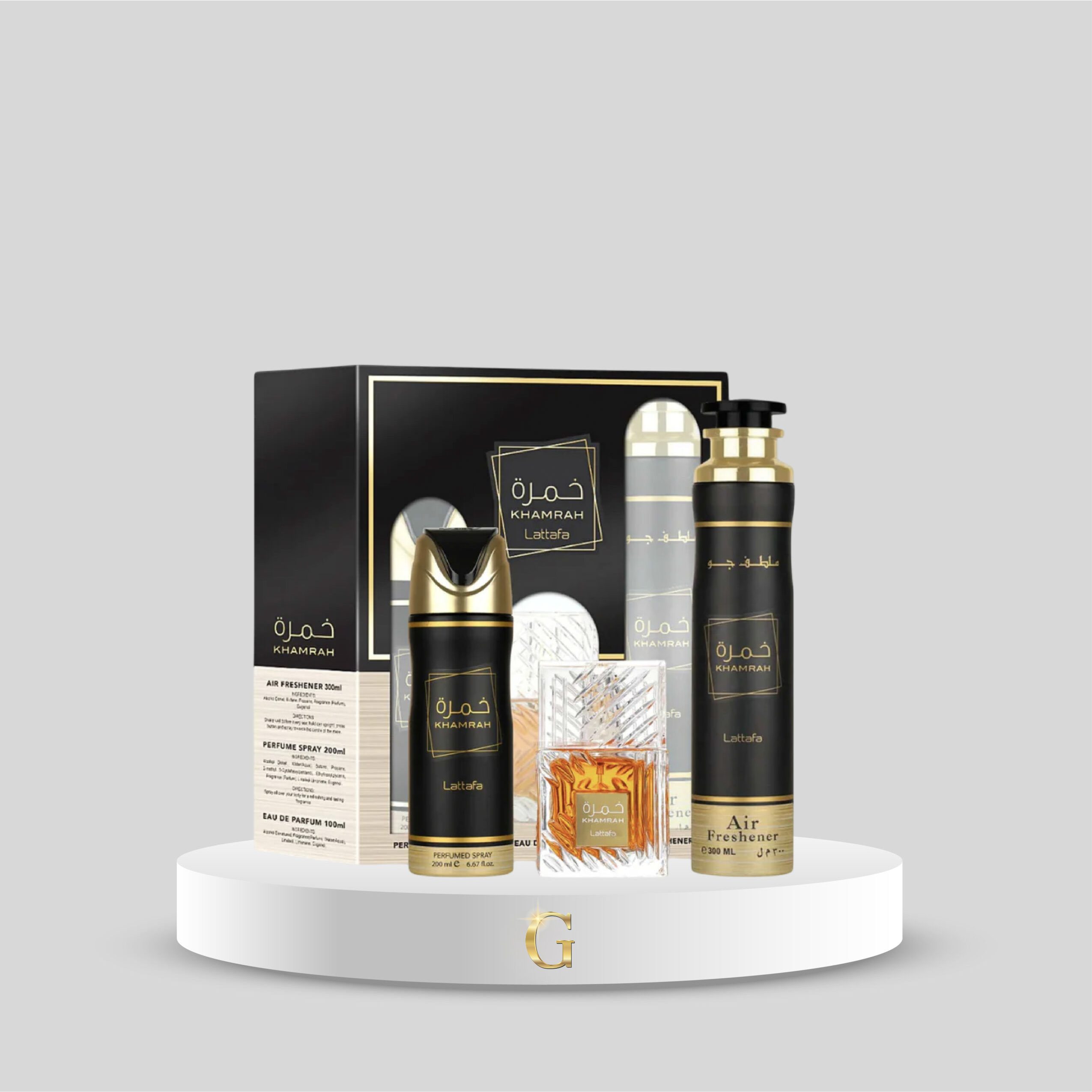 Incluye: Khamrah 100ml + Spray Corporal Khamrah 200ml + Ambientador en Spray Khamrah 300ml